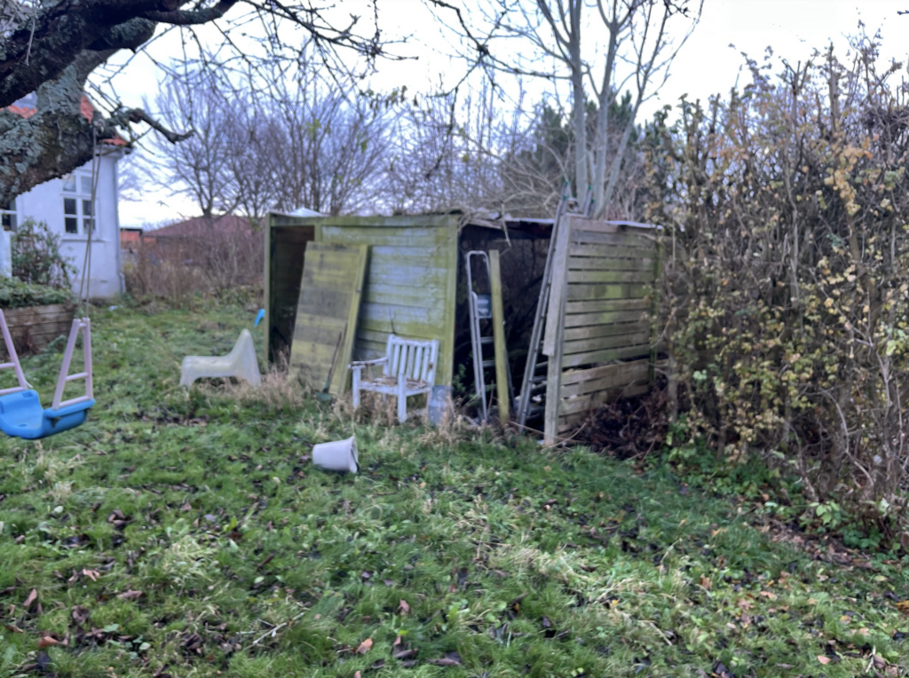Til ejendommen følger en stor have, som via en havelåge fra carporten samt husets to udgange via stuen og gangen er adgang til med en flot udsigt ud over marker.