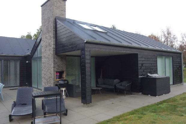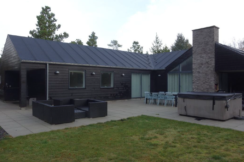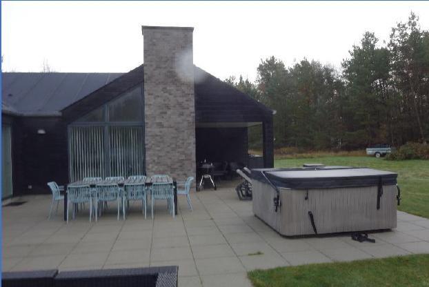 Udvendigt er der stor terrasse med spabad samt stort areal til legeplads.