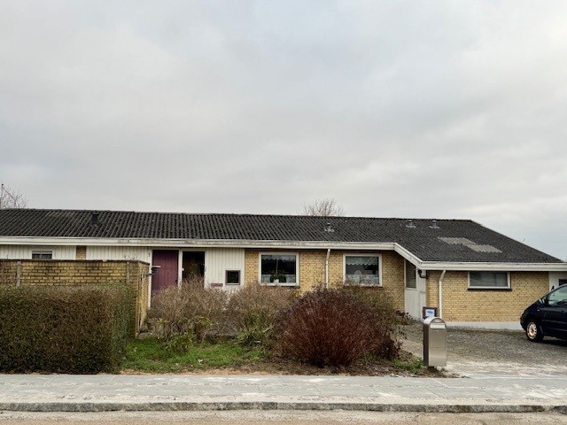 Ejendommen er et gulstenshus med et bølge fibercement herunder asbest ifølge BBR og hvide vinduer. Foran huset er der et stort flisebelagt areal og en carport.
