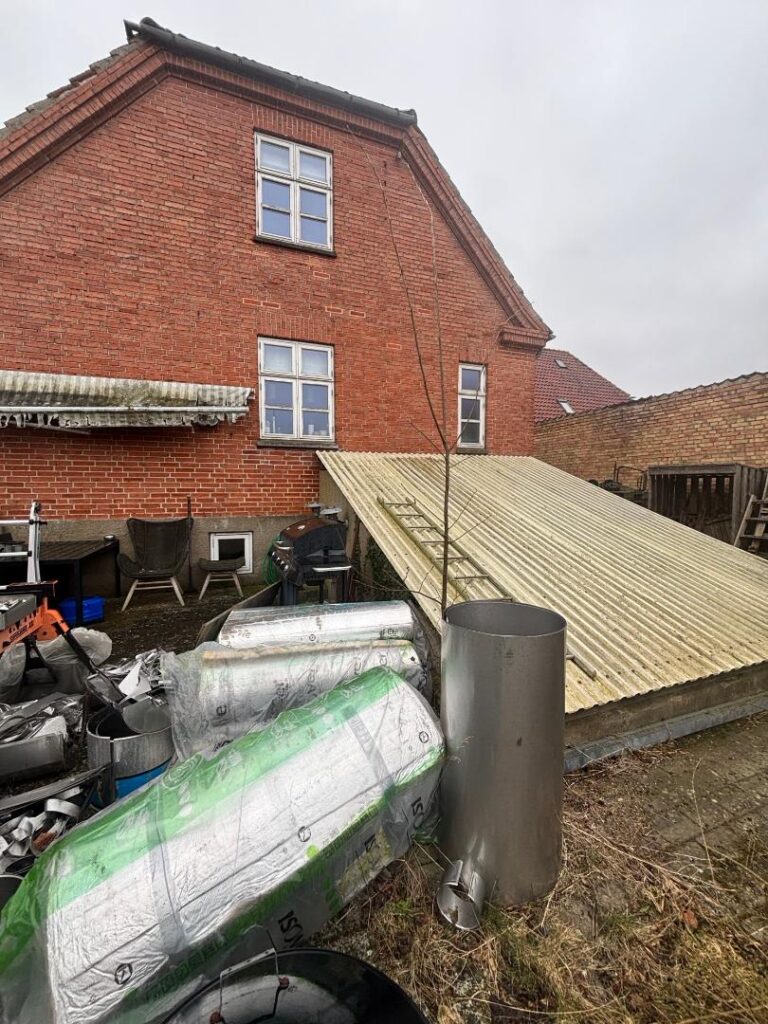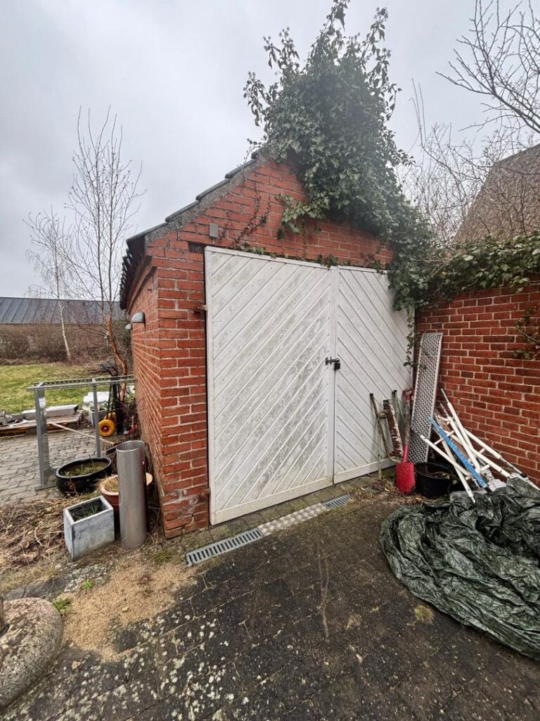 Herudover en rød murstensbygning på 15 m² (BBR) med sort tegltag.