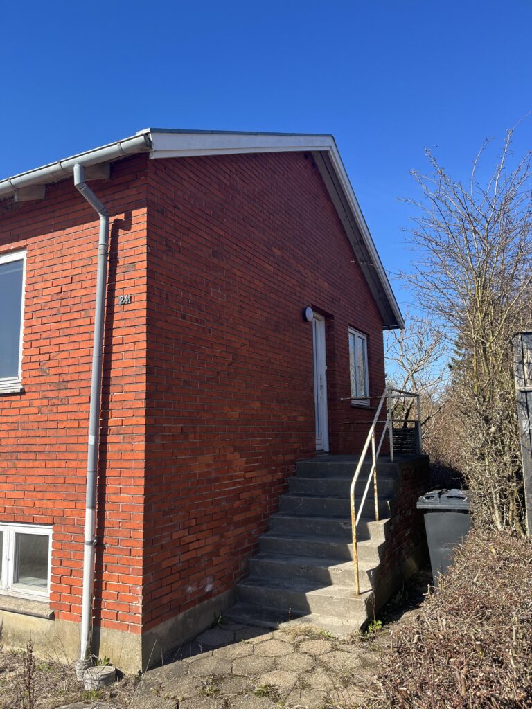 Indgang til fordelingsentré med klinker. Fra entréen er der indgang til badeværelse med lyse klinker på vægge og sorte klinker på gulvet samt adgang til værelse med trægulv. Fra entréen er der adgang til gang ud til bryggers. Både gang og bryggers fremstår råt med cementgulv og manglende færdiggørelse. Åben stue og køkken med samme klinker som i entréen. I køkkenet fremstod ved besigtigelsen følgende hårde hvidevarer: