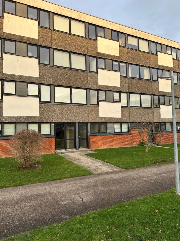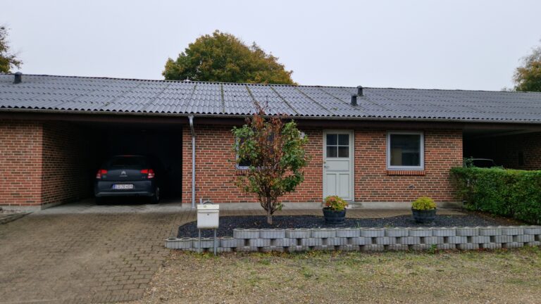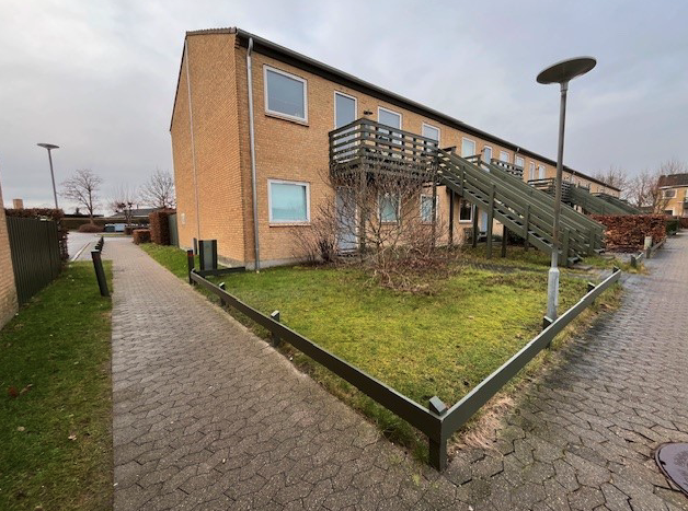 Ejendommen er opført i røde mursten og der er hvide vinduer.