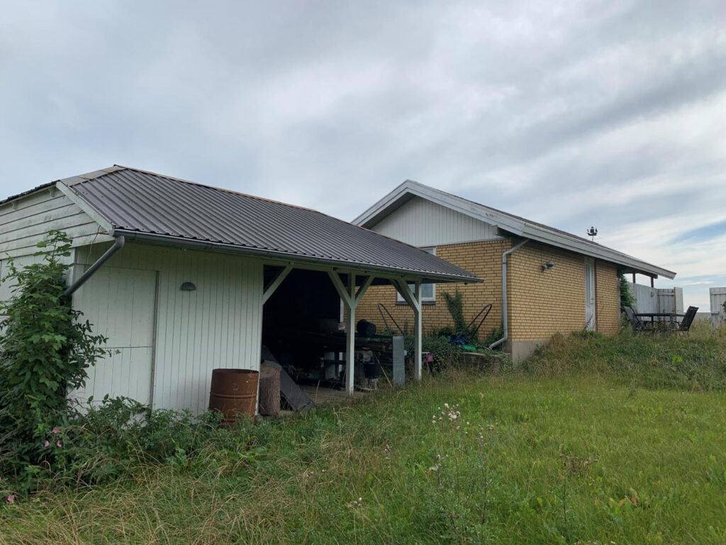 Ydervægge i mursten og tagdækning i fibercement, herunder asbest.