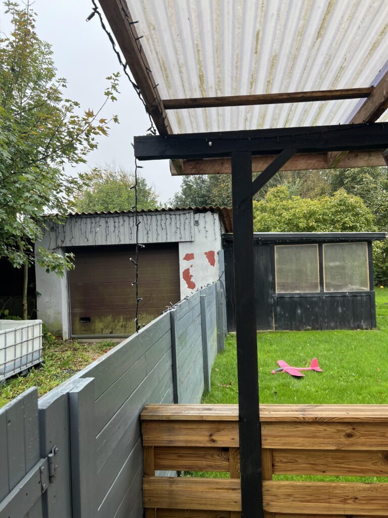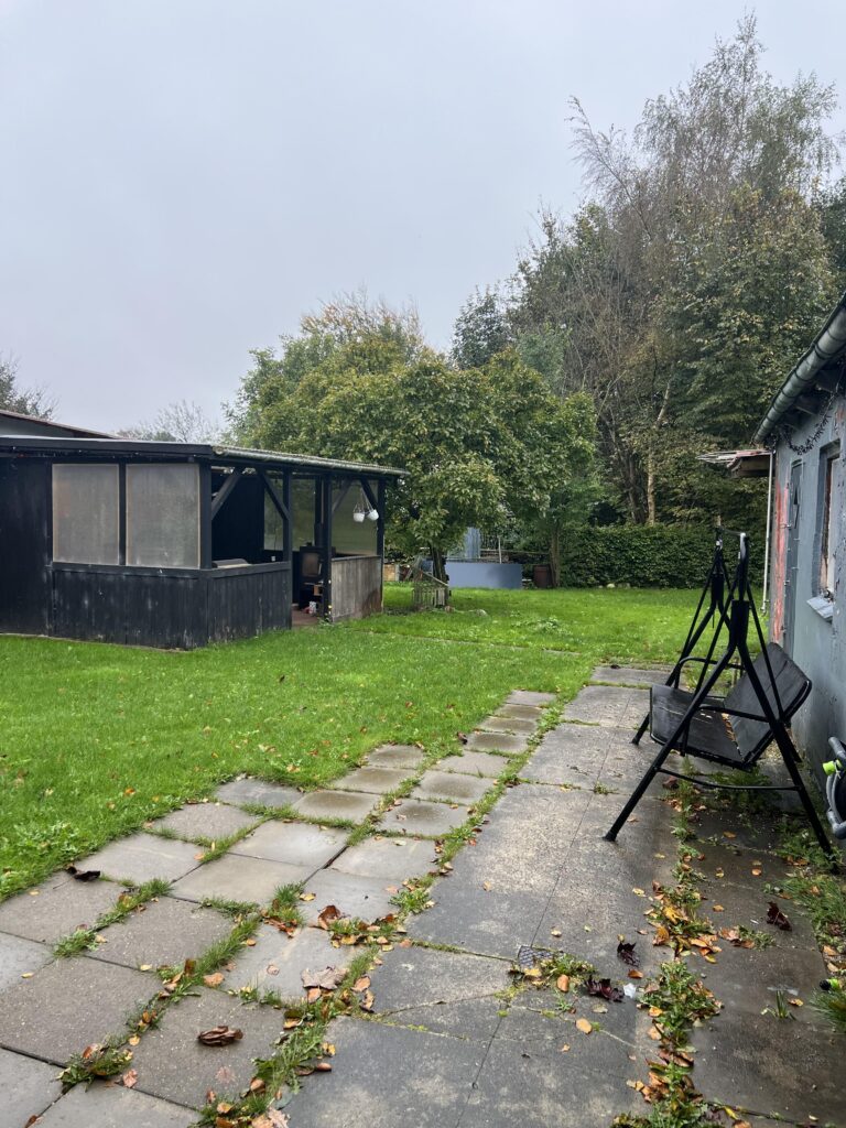 Den første entré med adgang fra haven er belagt med et gulvtæppe, farvet vægge samt hvidt loft. I denne entré er der placeret en varmtvandsbeholder. Fra entréen er der adgang til et værelse på venstre hånd, som er belagt med lyst trægulv, hvide vægge og hvidt loft.