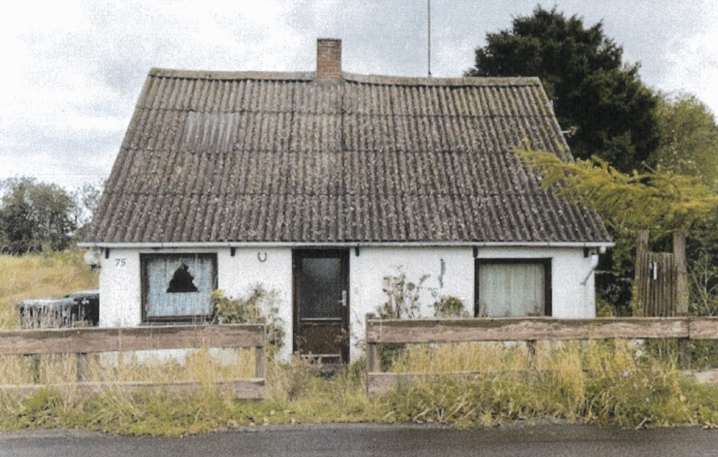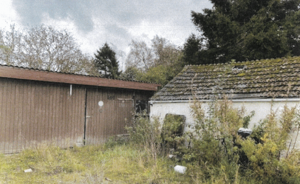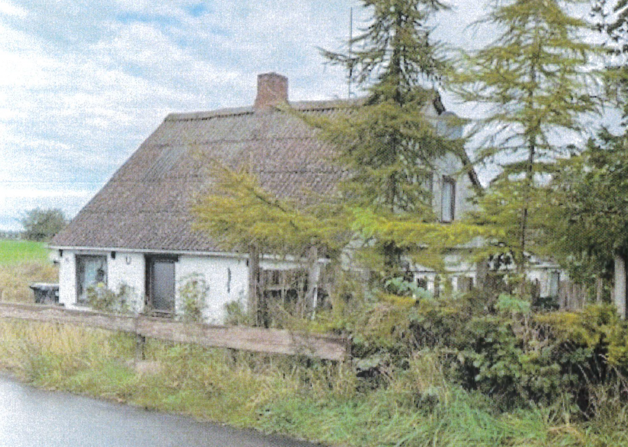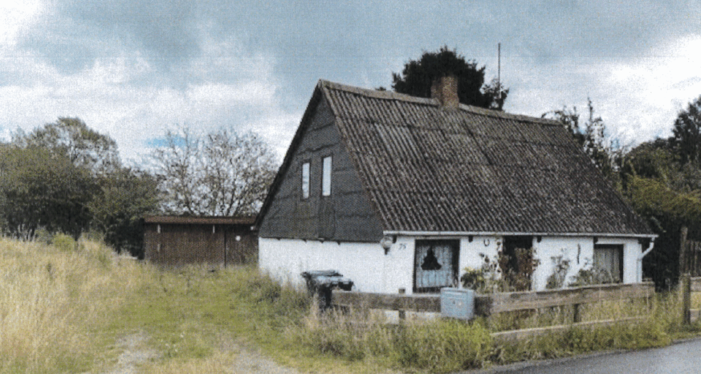 Mindre landhus beliggende ud til landevej. Huset fremstår slidt og medtaget. Haven er uplejet. Bag huset er der skur, som er fyldt med diverse inventar.