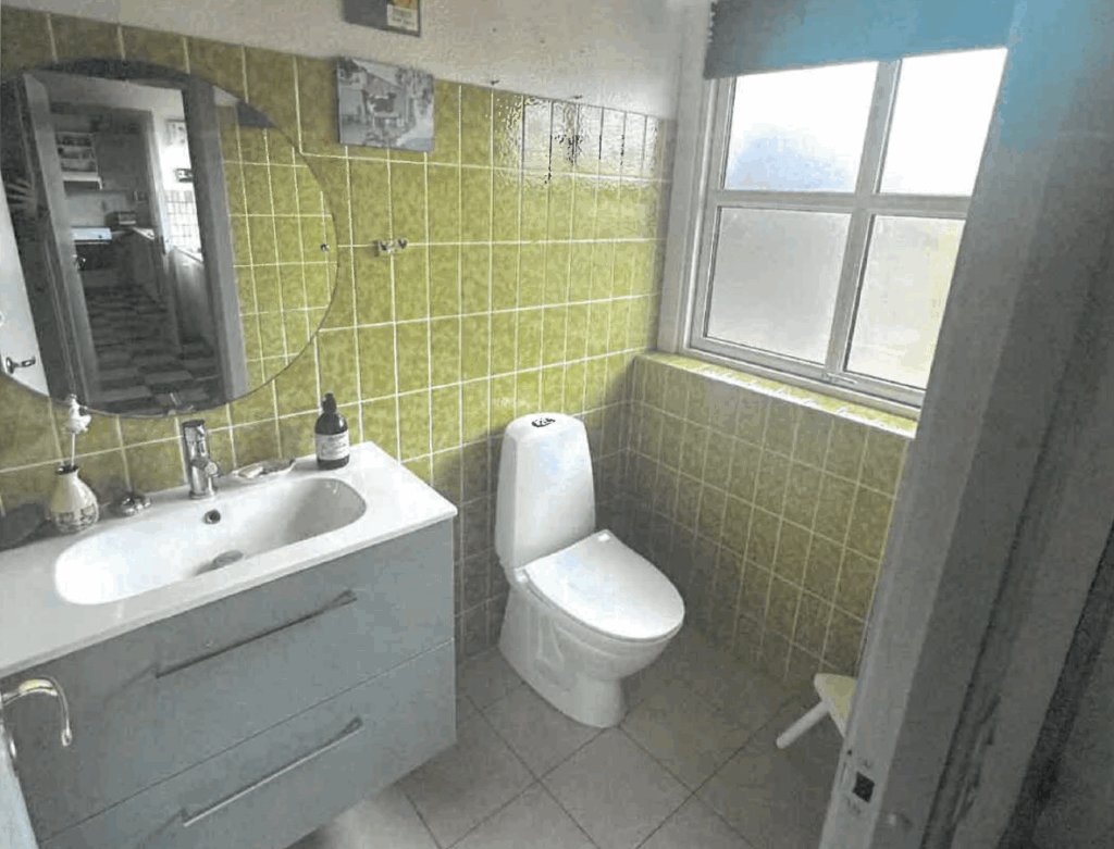 Fra ejendommens hovedindgang kommer man ind i en entré med brunlige klinker og trægulv. Fra entréen er der videre adgang til ejendommens fordelingsgang og bryggers. Fordelingsgangen er med lyst trægulv og træloft. Langs fordelingsgangen er ejendommens 4 værelser, badeværelse og gæstetoilet placeret. Tre af værelserne er med gråligt gulvtæppe og træloft, mens det sidste værelse er med trægulv. Badeværelset er med klinker med lyse brunlige nuancer på gulv og vægge. Badeværelset indeholder bruseniche, badekar samt håndvask med underskuffer. Underskufferne er hvide med stål greb. Gæstetoilettet er med grønne klinker på væggen samt lyse beige klinker på gulvet. Gæstebadeværelset indeholder toilet samt håndvask med underskuffer. Skufferne er med blålige fronter og stålgreb.