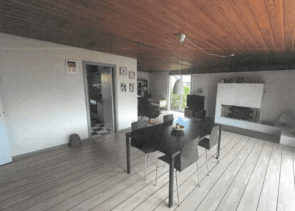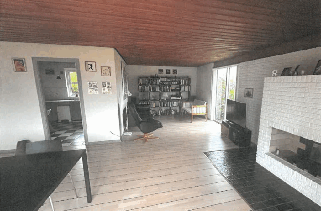 Fra køkkenet er der adgang til ejendommens store stue, som er med samme trægulv som i fordelingsgangen samt træloft. I det ene hjørne af stuen er der placeret en indbygget pejs. Rekvirenten tager forbehold for, at denne skal skiftes i forbindelse med ejerskifte iht. ejerskifterodningen. Fra stuen er der via en terrassedør adgang til den udendørs fliseanlagte terrasse.