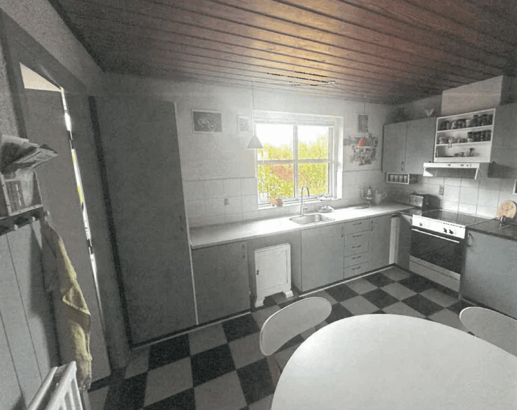 Fra bryggerset er der videre adgang til køkkenet, som er med samme gulv, som i bryggerset, samt træloft. Køkkenet er med lysbeige fronter med stålgreb. I køkkenet er der hvidevarer i form af komfur, emhætte og køle-/fryseskab.