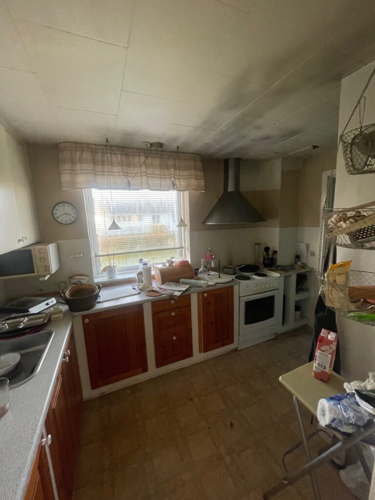 Indvendigt er der flere steder i rummene tegn på fugt i form af mørke plamager på lofter og vægge. Ældre køkken med underskabe i mørkt træ og hvide overskabe med bordplade af laminat, ovn og køleskab af ældre dato. Der er et lille hul i loftet i køkkenet, ligesom loftet har sorte mærker som følge af fugt/sod.