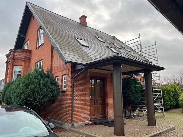 Tag med kraftig hældning og belagt med eternitplader eller lign.
