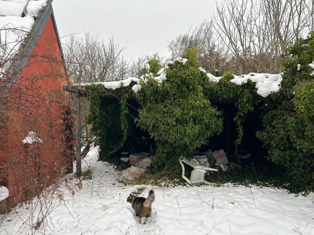Herudover findes en overdækket carport i hvidmalet træ. Carporten mangler vedligeholdelse.