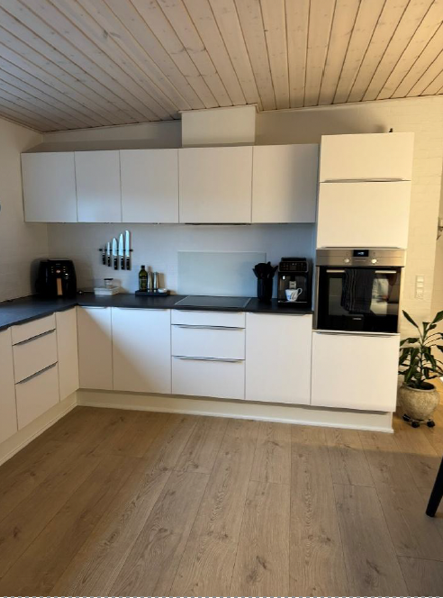 Køkken i hvide elementer med mørkegrå bordplade. I køkkenet forefindes køle-/fryseskab, opvaskemaskine, ovn, kogeplade og emhætte (alle Siemens).