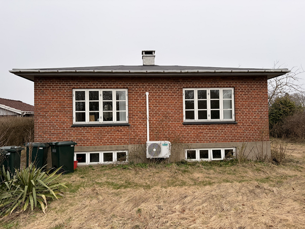 Huset er hvid, vandskuret murstensvæg med sort malet sokkel.