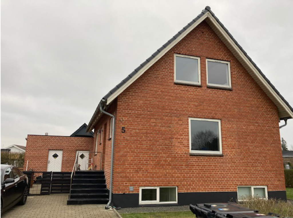 Adgangen til boligen sker via en kort trappe med 7 trin, som fører op til hoveddøren.