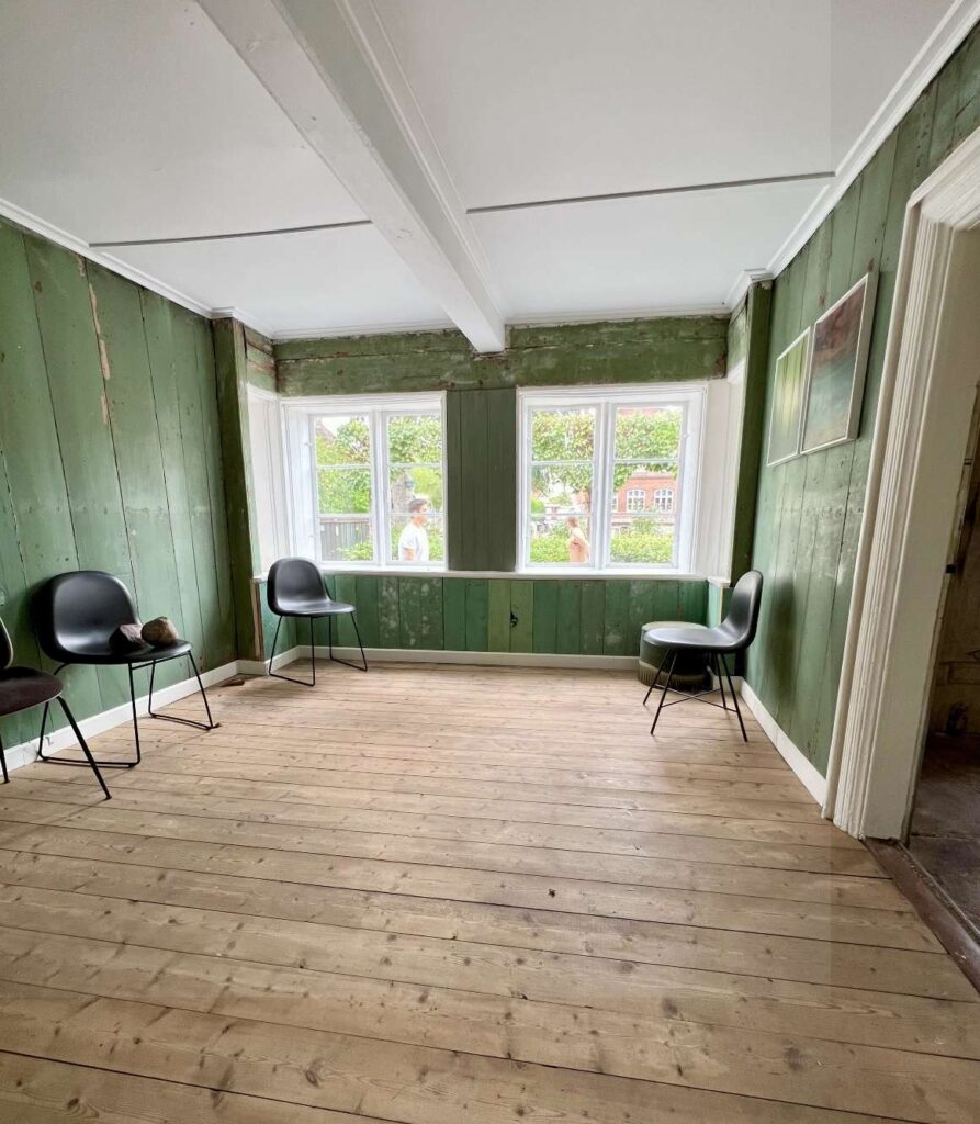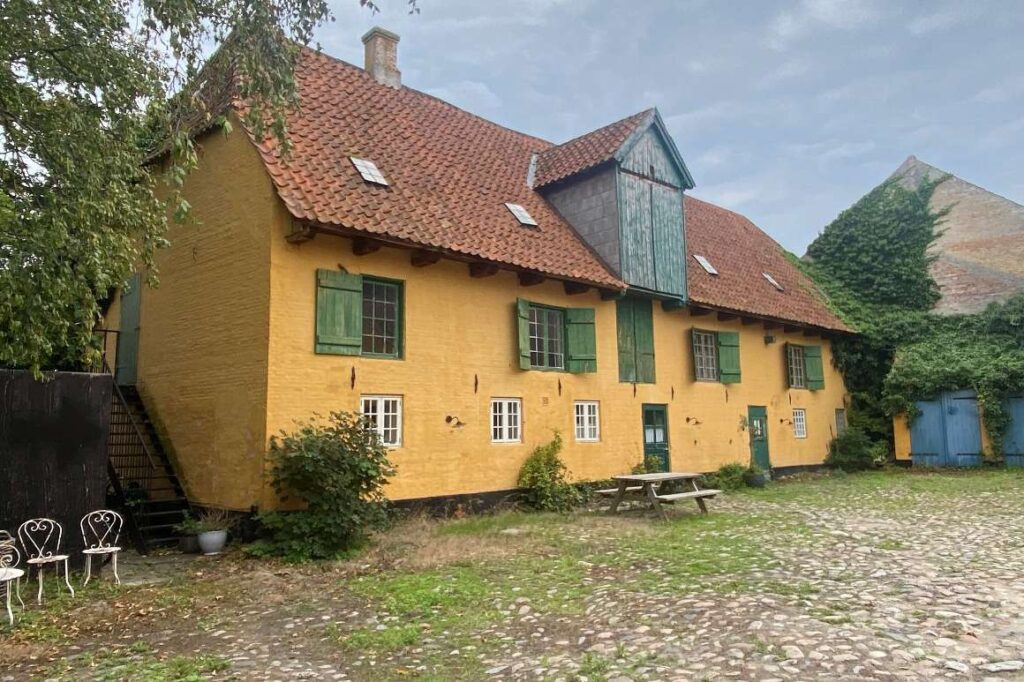 Ejendommen er opført i gule mursten med grøntmalede vinduespartier. Der hører en have til ejendommen.