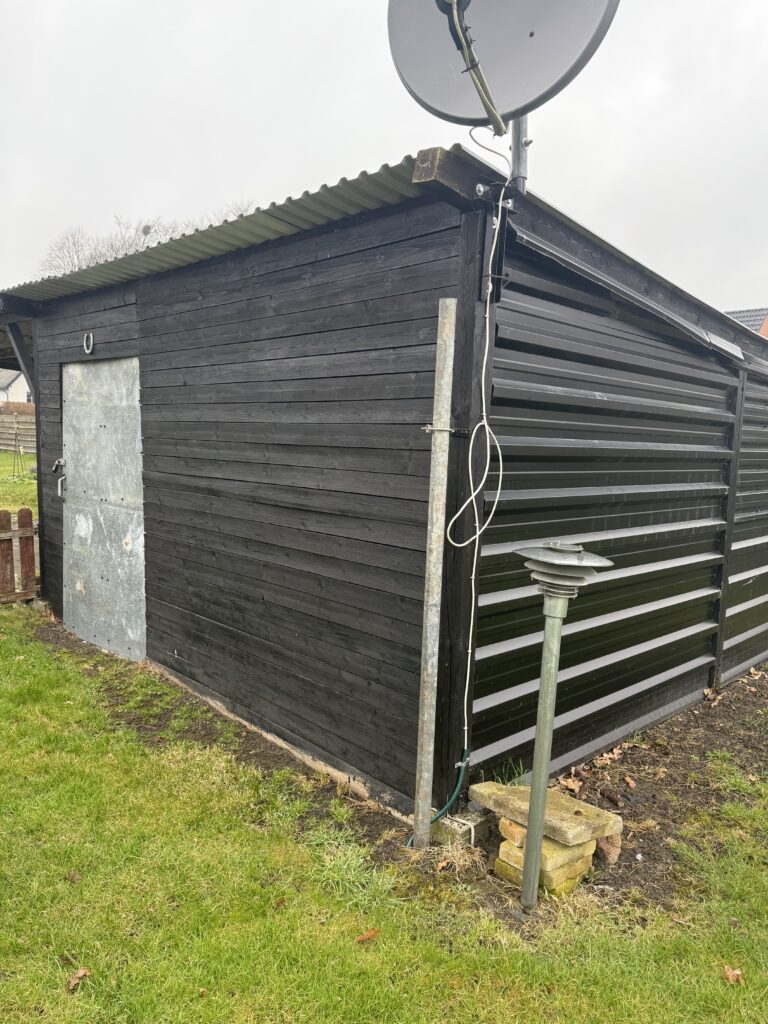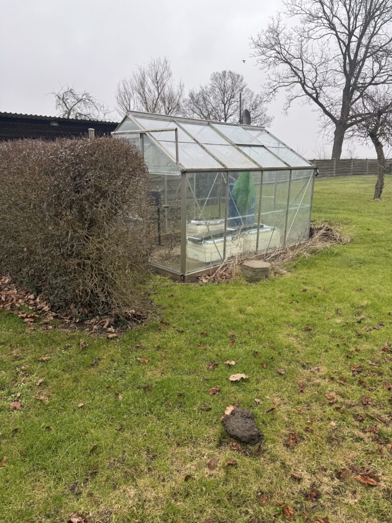 På grunden forefindes træskur (sammenbygget med huset), en carport opført i træ med tilhørende redskabsrum samt et drivhus.