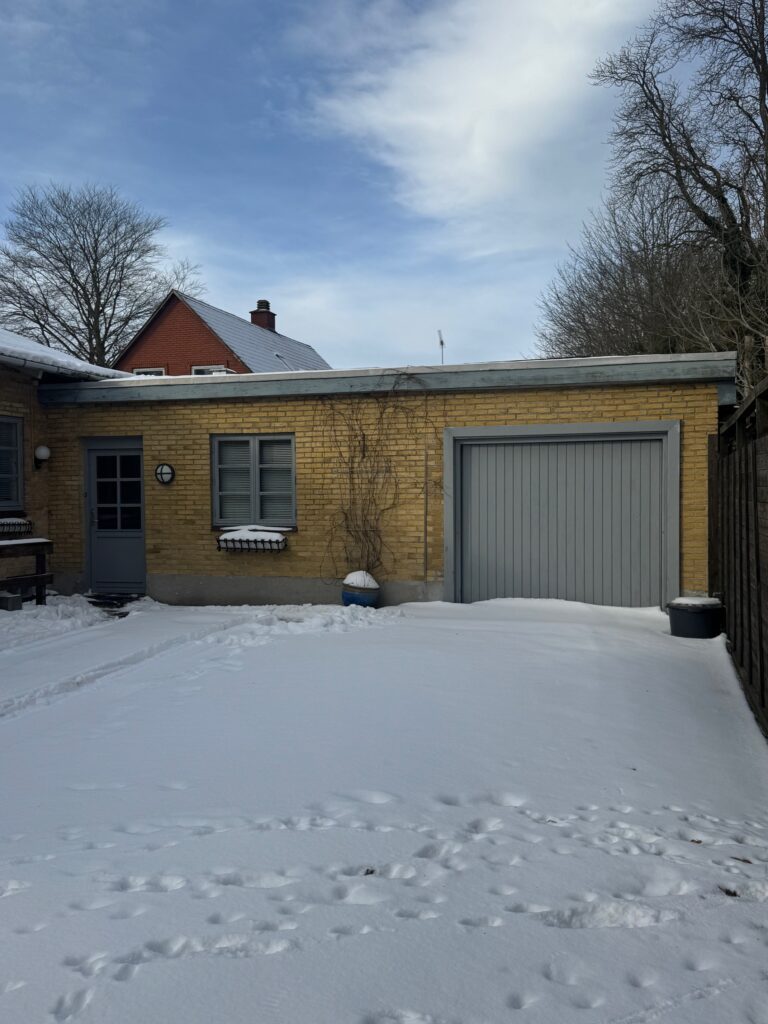 Ejendommen er opført i gule mursten med tag af sorte tagplader.