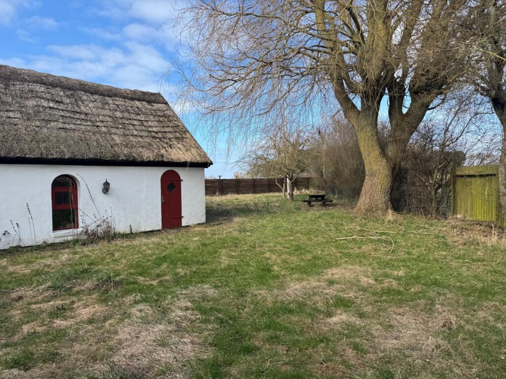 Videre fra gangen er der et værelse med flisegulv, træloft og brændeovn samt udgang til haven.