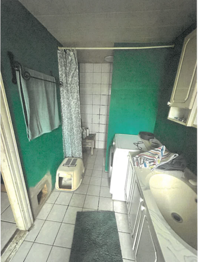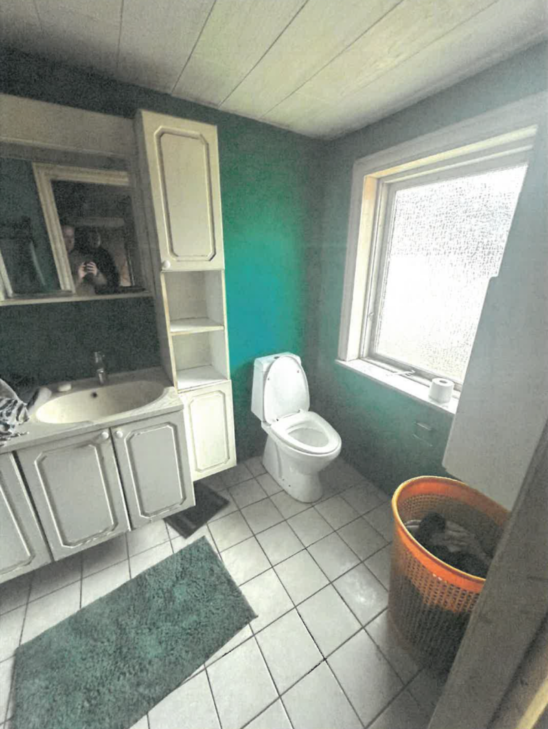 Bag fyrrummet er ejendommens badeværelse. Badeværelset har lyse klinker på gulvet samt lyst træloft. Badeværelset indeholder bruseniche, toilet og håndvask med hvide underskabe med udskæringer.