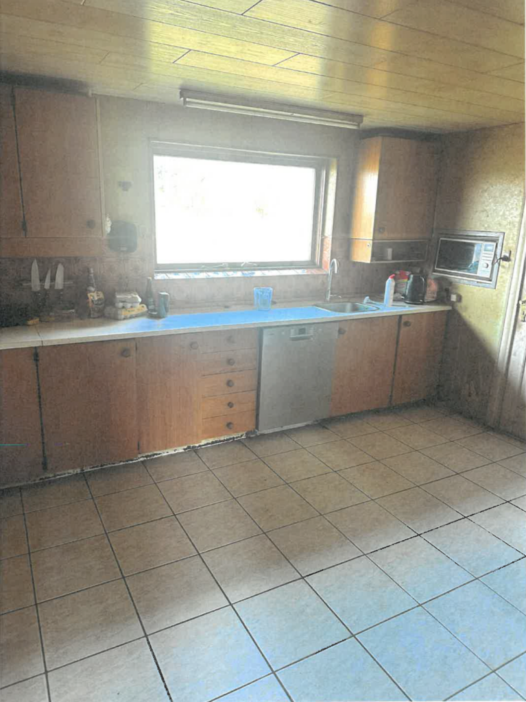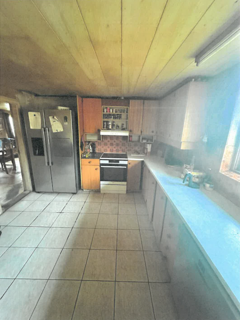 Lige frem for entreen er køkkenet. Køkkenet har samme lyse klinker som i entreen og lyst træloft. Selve køkkenet er af ældre dato med fronter i mørkt træ og lys bordplade. Køkkenet indeholder hvidevarer i form af opvaskemaskine, komfur, emhætte og køleskab.