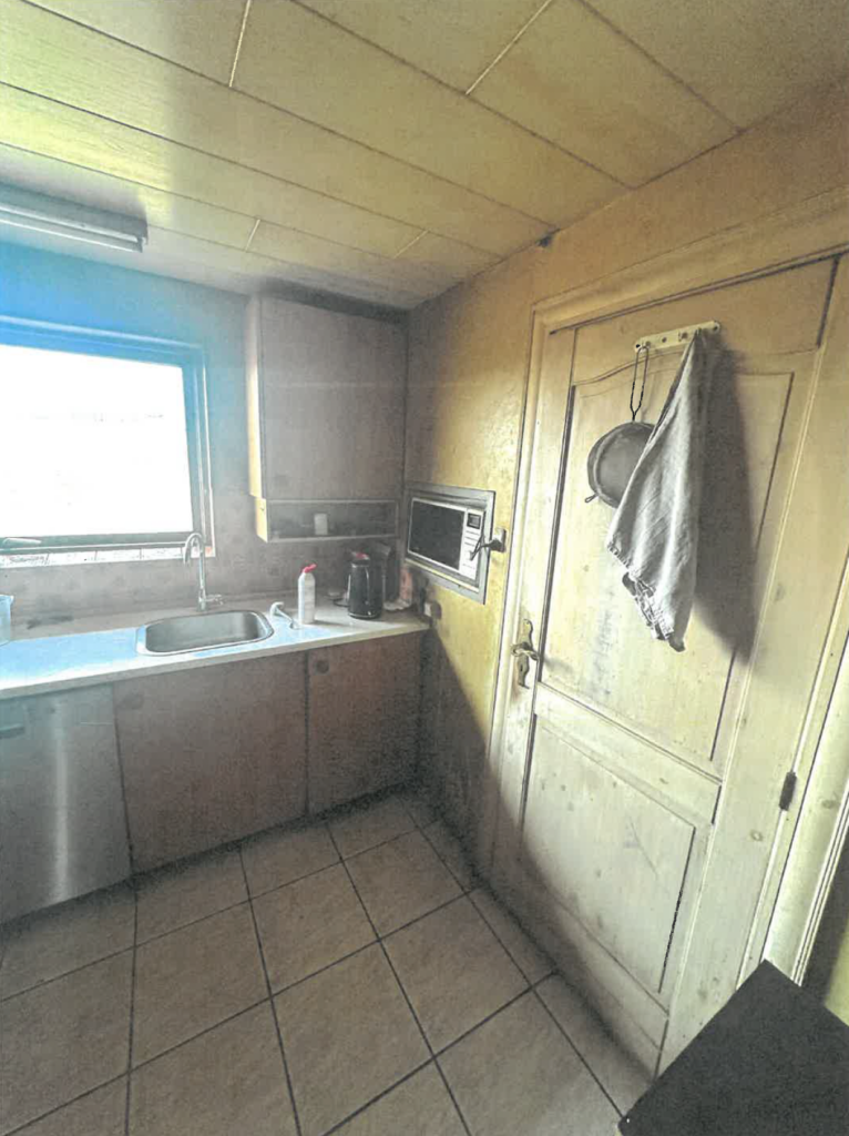 Til højre for køkkenet er spisekammeret placeret. Spisekammeret har gulv i finerplader og hvidt loft.