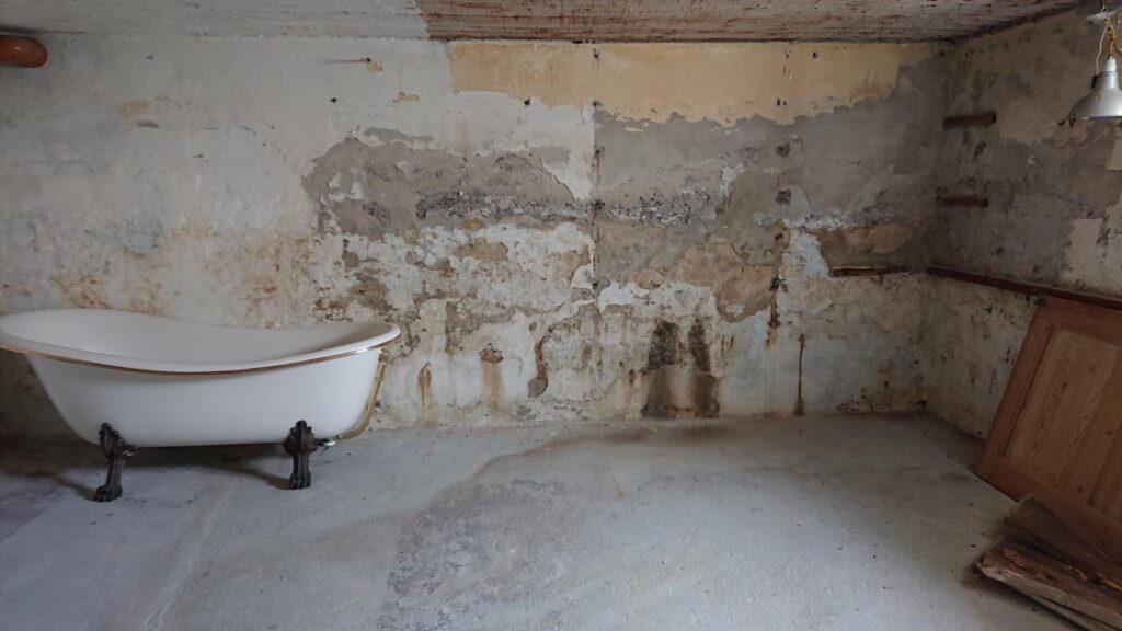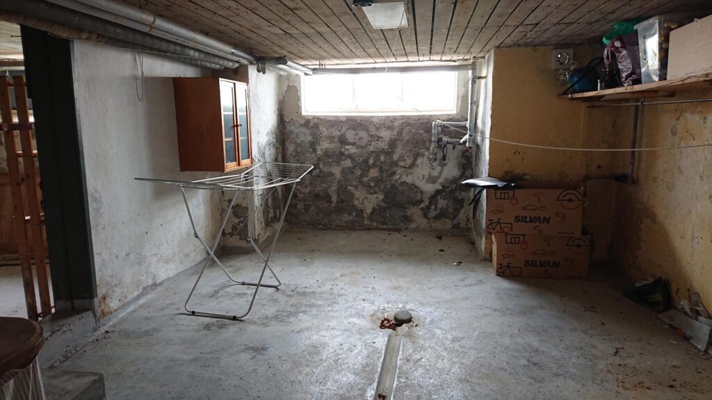 Kælderen (på 74 m²) består af “badeværelse” med spabad og bruser samt 2 disponible rum.