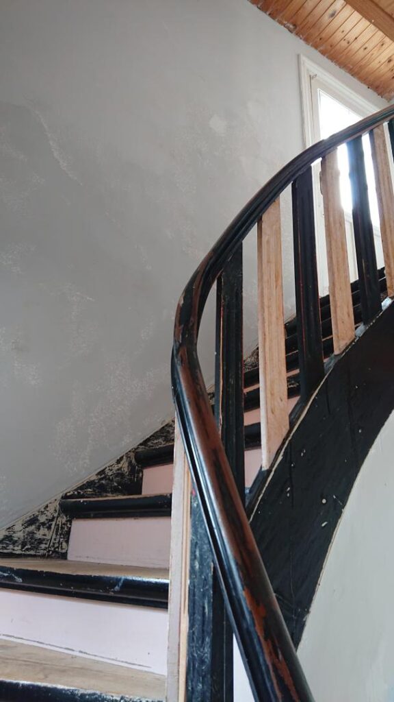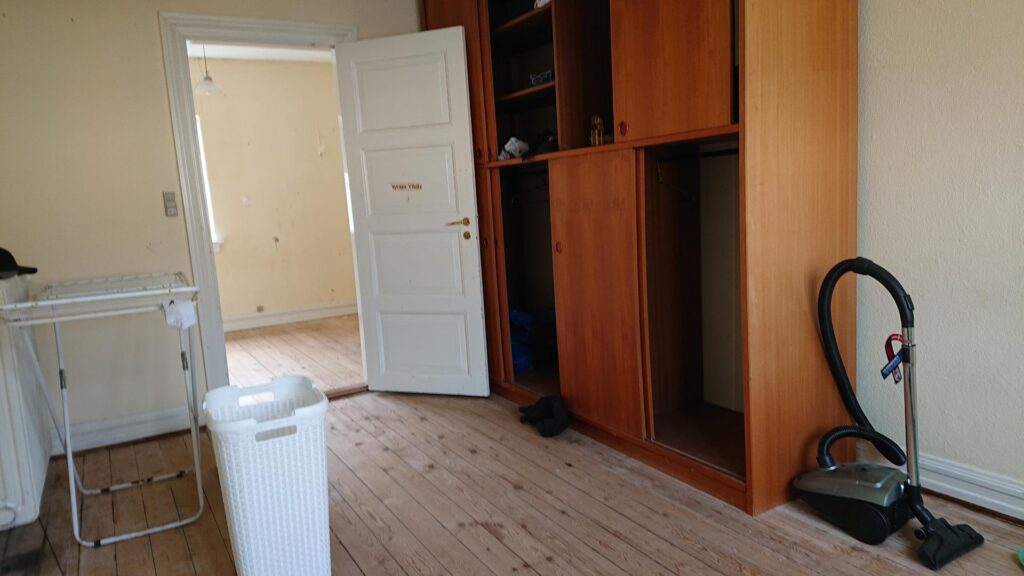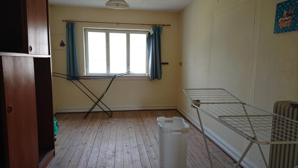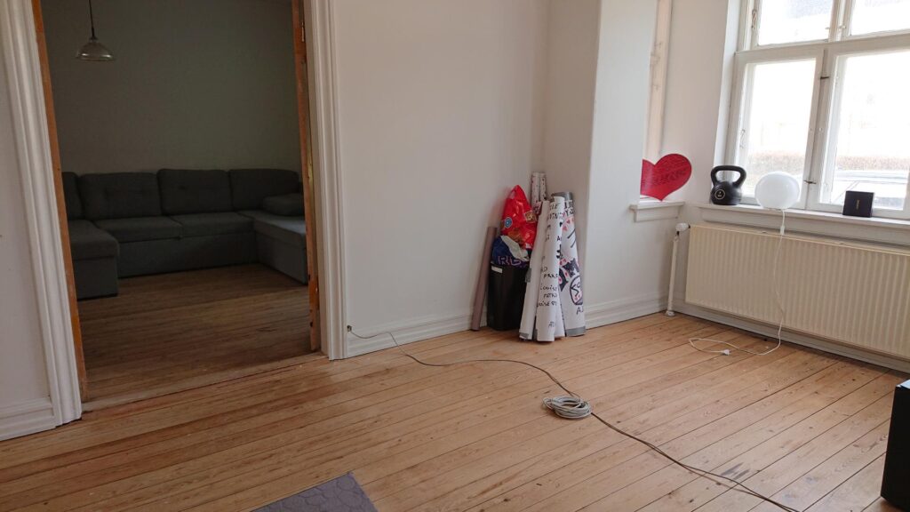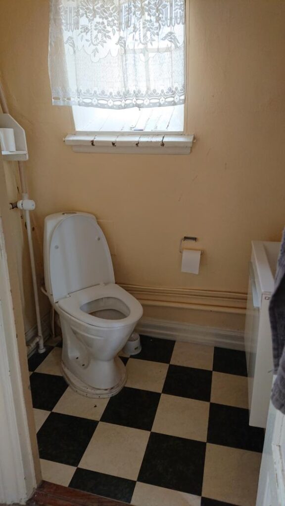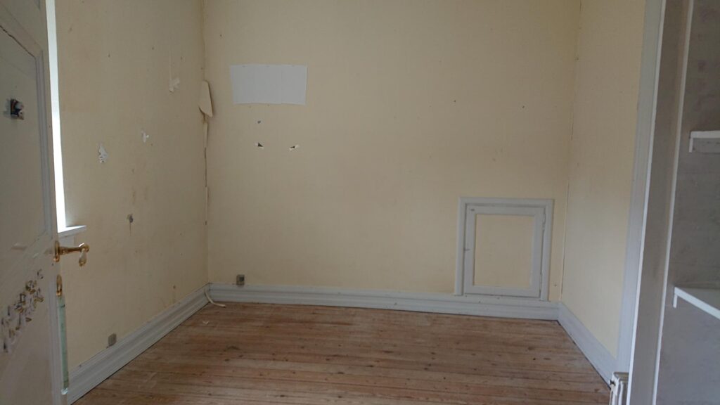 1. salen indeholder 3 værelser (man skal igennem det ene værelse for at komme ind til det næste) samt et lille toilet.